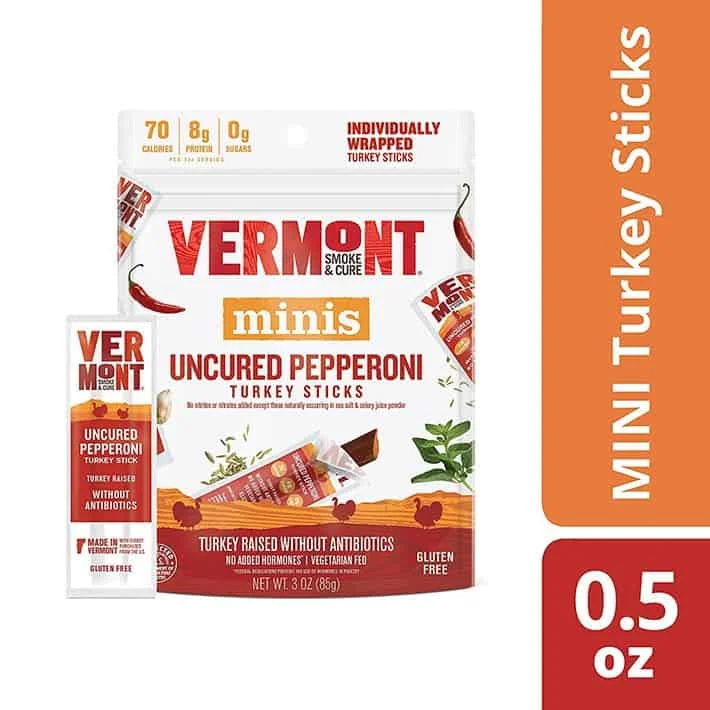 These paleo-friendly, low carb, low calorie, high protein on-the-go meat snack with 5g protein, 35 calories, and 1g carbs are great for your keto diet. You can leave the pizza behind and snack on your favorite part with this delicious pepperoni-flavored Vermont Smoke & Cure Mini Jerky Stick Go Pack.